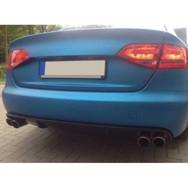 Spoiler zadního nárazníku difuzor Audi A4 B8 2007-2011 (2x 2koncovky VLEVO + VPRAVO), vzhled RS4. Spoiler je vhodný pro sedan i combi. Materiál: laminát. Vyrobeno z vysoce kvalitního sklolaminátu (GFK). Certifikovaný materiál (testováno TUV). Super kvalita a cena, jedinečný design, velmi elegantní vzhled. Dodáváno v černé základní barvě. Určeno pro lak. Homologace TUV (materiál) – vyražena. Jsme přímým dovozcem!