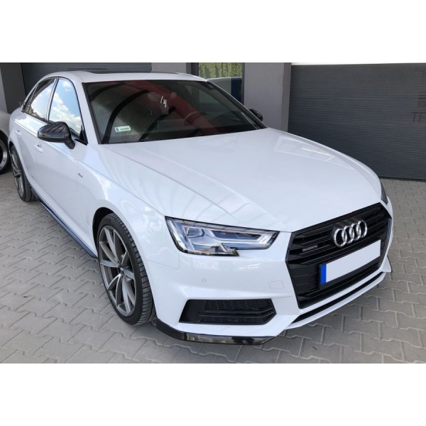 Spoilery předního nárazníku Audi A4 B9 S-LINE 2015-2019 (2-dílný). Určeno pro nárazníky S-LINE!! Materiál: laminát. Vyrobeno z vysoce kvalitního sklolaminátu (GFK). Certifikovaný materiál. Homologace TÜV – vyražena na spoilerech. Sportovní vzhled. Dodáváno v černé základní barvě. Určeno pro lakování. Super kvalita. Uvedená cena je za pár. Jsme přímým dovozcem!