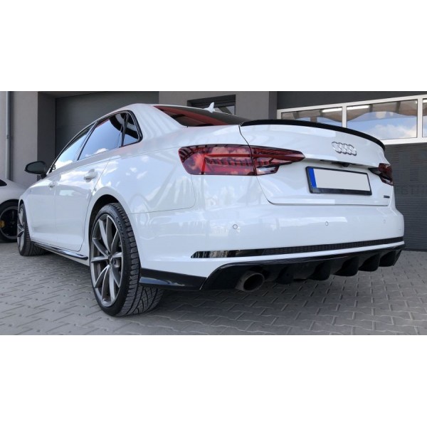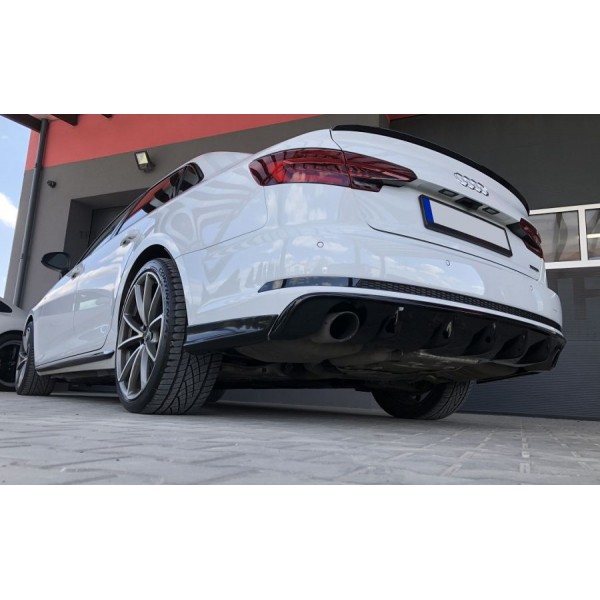 Spoilery zadního nárazníku Audi A4 B9 S-LINE 2015-2019 (2 díly). Určeno pro nárazníky S-LINE!! Materiál: laminát. Vyrobeno z vysoce kvalitního sklolaminátu (GFK). Certifikovaný materiál. Homologace TÜV – vyražena na spoilerech. Sportovní vzhled. Dodáváno v černé základní barvě. Určeno pro lakování. Super kvalita. Uvedená cena je za pár. Jsme přímým dovozcem!